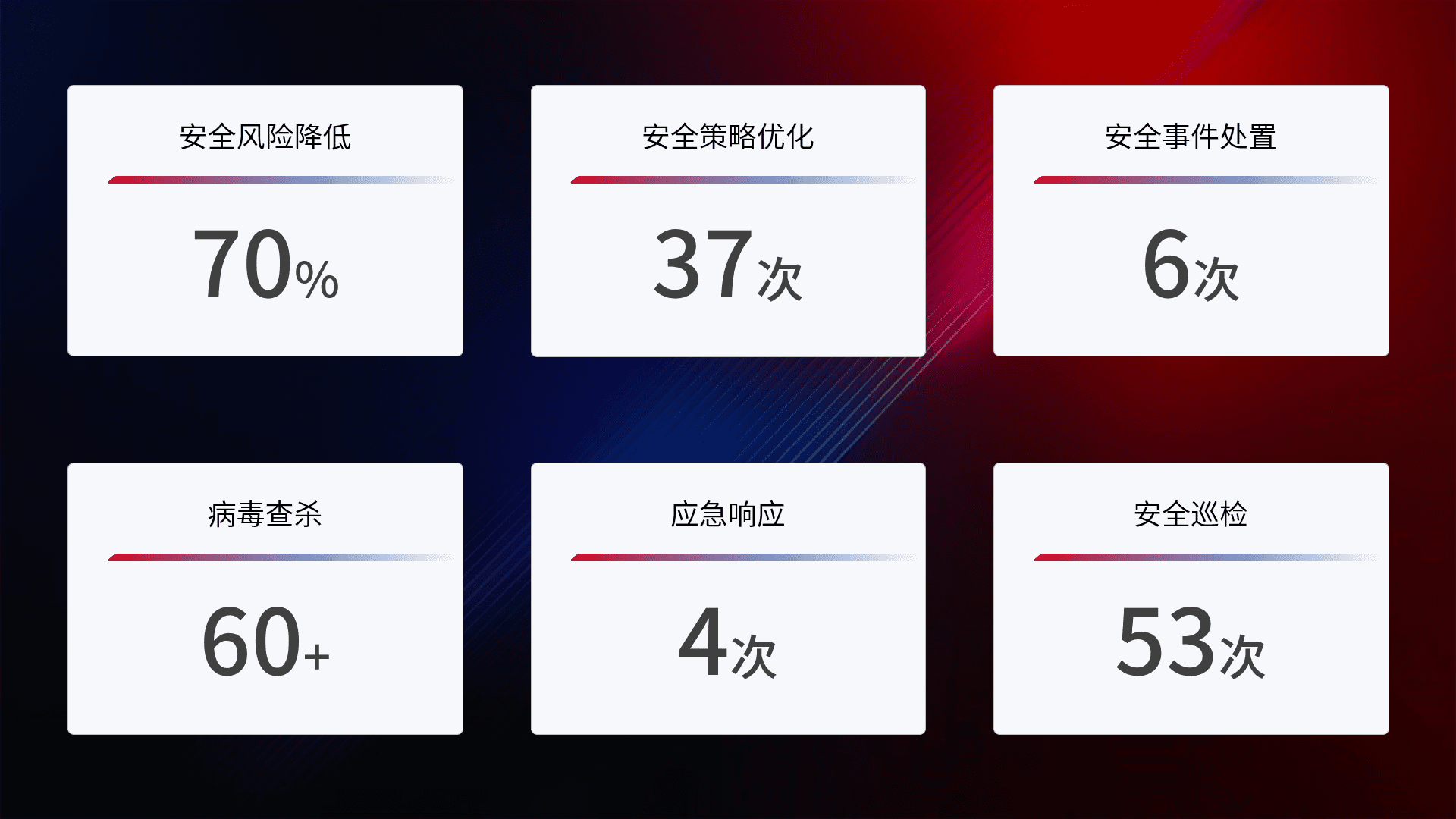 提供全面的安全事件报告体系,,,包括处置报告、、周报、、季度和年度总结,,,结合持续监控,,,帮助客户深入了解网络安全状况。。。